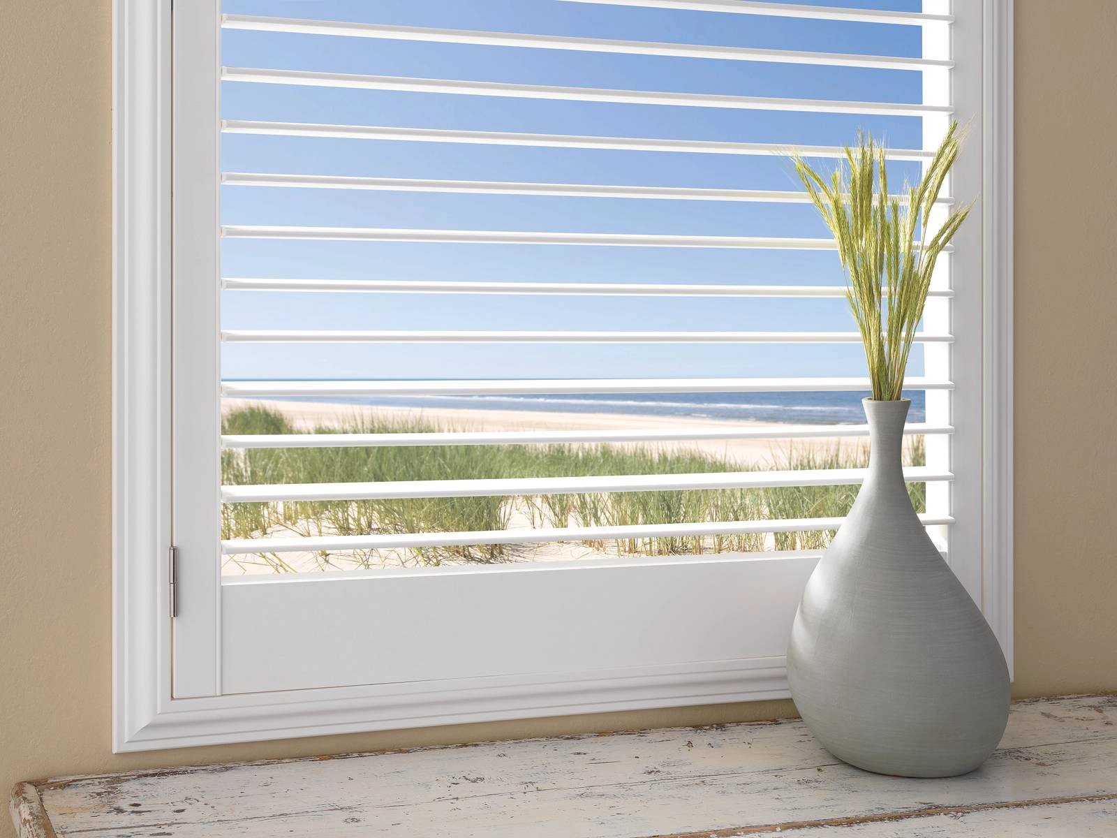 Palm Beach™ Polysatin™ Vinyl Shutters are available in three versatile neutral hues: mid-tone white, bright white, and off-white. They have a Decorative Sill Cover option that creates a sill or covers an unattractive one. Vinyl shutters also have more control options than wood or composite styles.